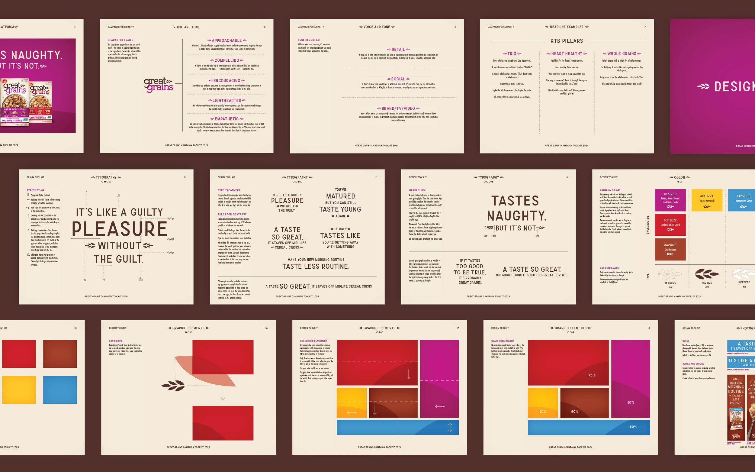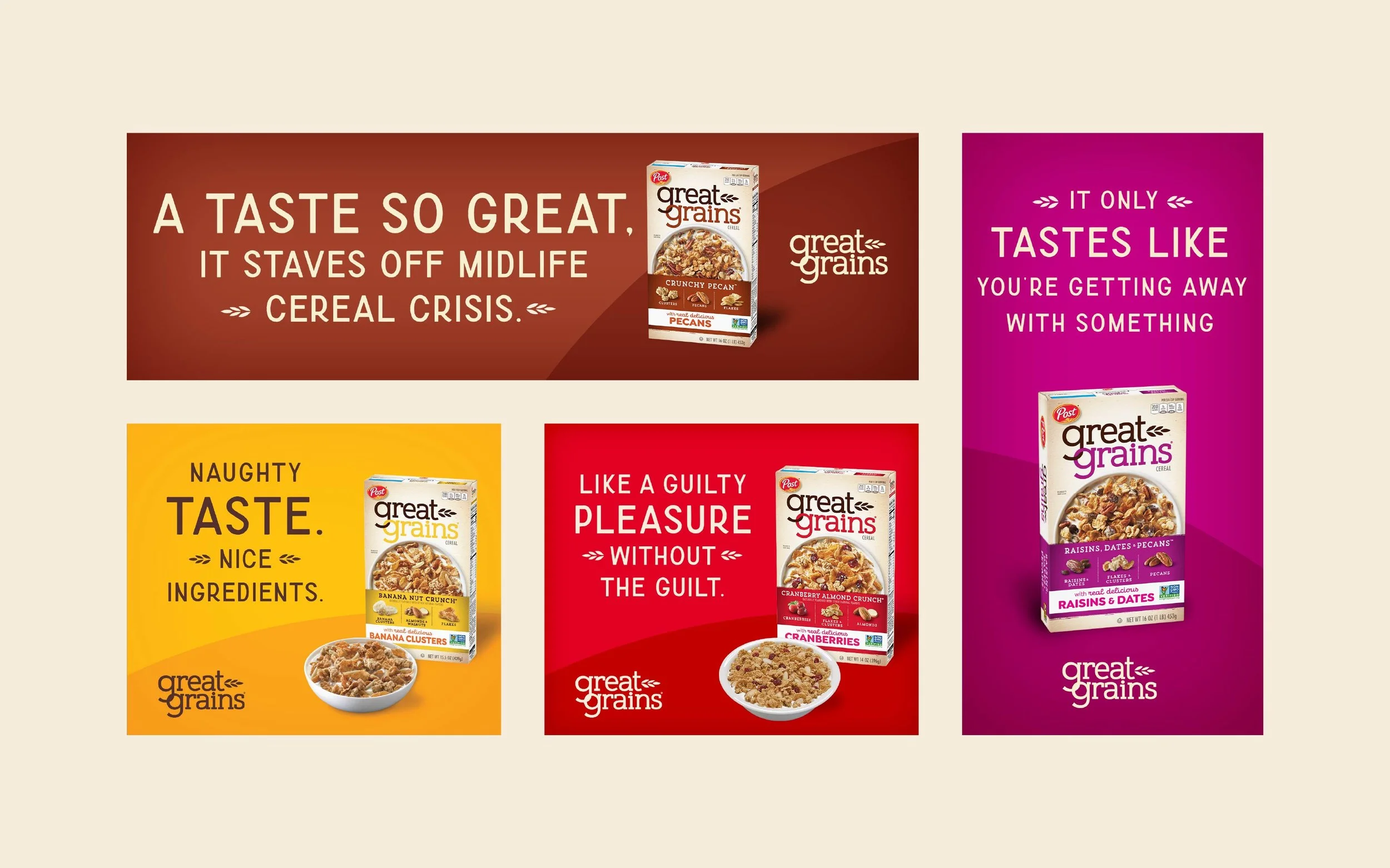 Along with the cheeky video spots, we created a campaign look for that harnessed the Great Grains brand assets for digital ads and end cards, with brightly colored, clean backgrounds paired with a campaign font that felt ever-so-slightly rough around the edges for winking headlines. We also developed a robust campaign style guide for our client to replicate the look.